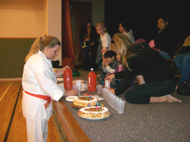 | Students getting ready to eat the cake that Mrs. Clark prepare for Sensei's Birthday. | ||