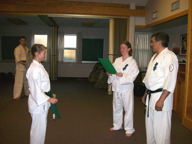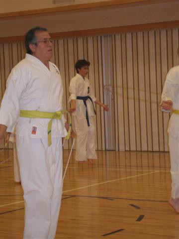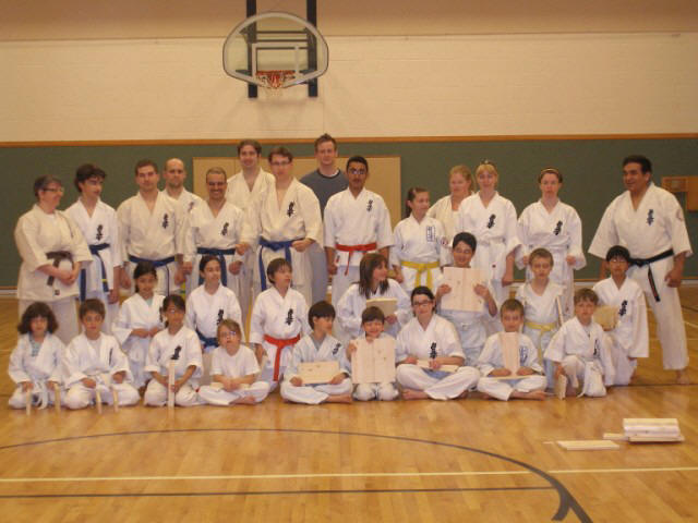 | Testing on Idogeiko (Uke Wasa): Left to right: Christopher, Victor, Laura, Alan, Mandeep, Remi, Mr. Ya. |