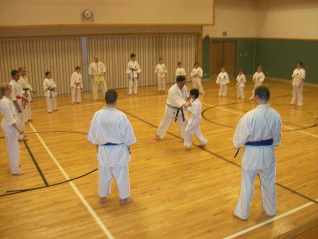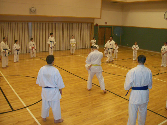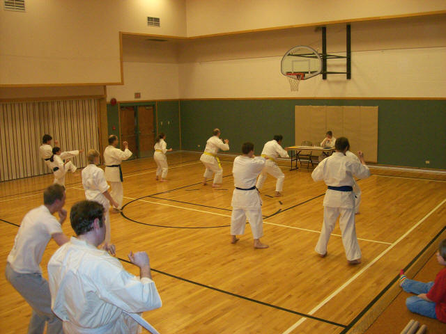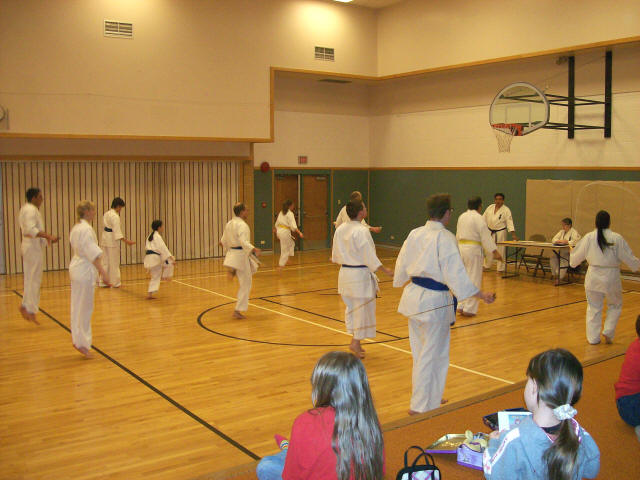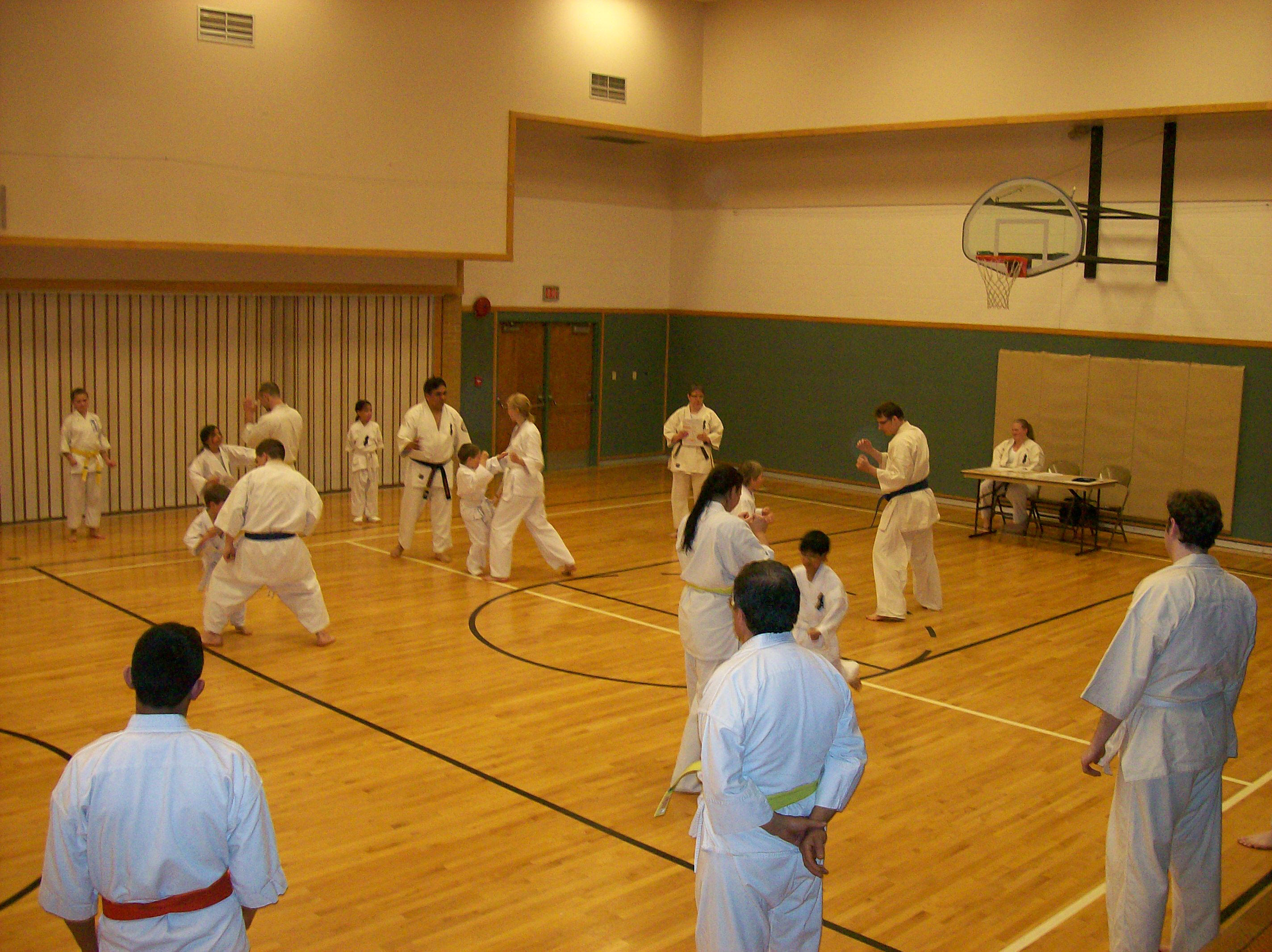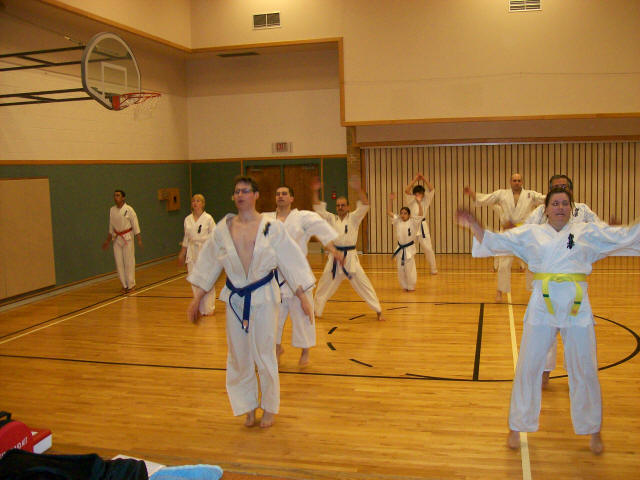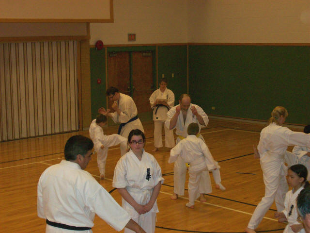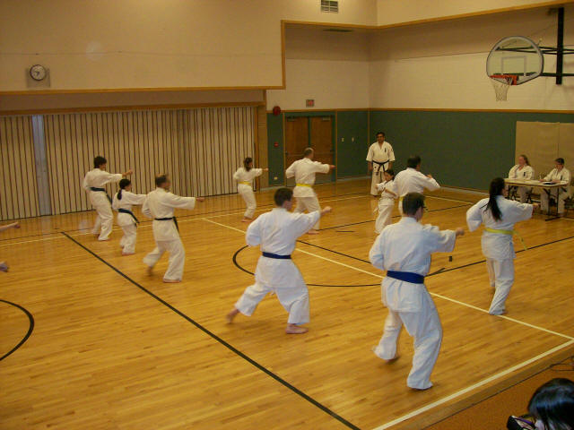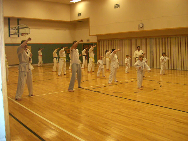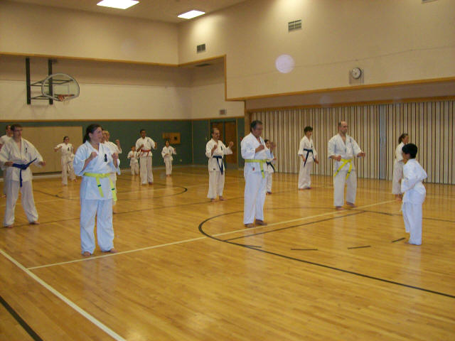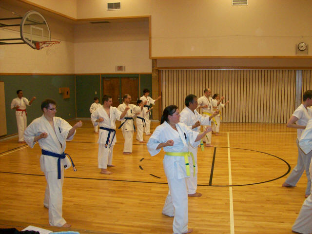 | Testing on Kihon Geiko (Uke Wasa): Left to right: Mandeep, Jacob, Christopher, Alan, Mr. Ya, Li, Je, Ms. Neil, Mr. Avalos, Remi, Daria, Jason, Benjamin. |
